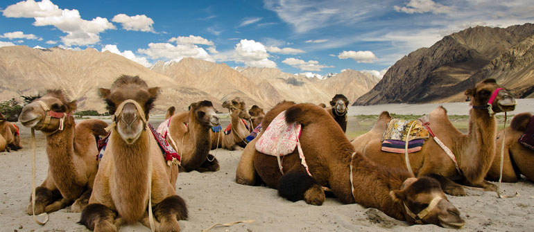 After breakfast, drive to Nubra Valley (Known as the Valley of Flowers and the warmest region in Ladakh) via Khardungla pass. This road is considered to be the highest motorable road of the world. En route, admire the spectacular views of the never ending snow-capped mountain ranges around Khardungla Pass (18,390 feet) After spending some time at Khardungla, proceed to Nubra. After Hotel check-in, enjoy camel Safari in the evening. Overnight stay in Nubra.